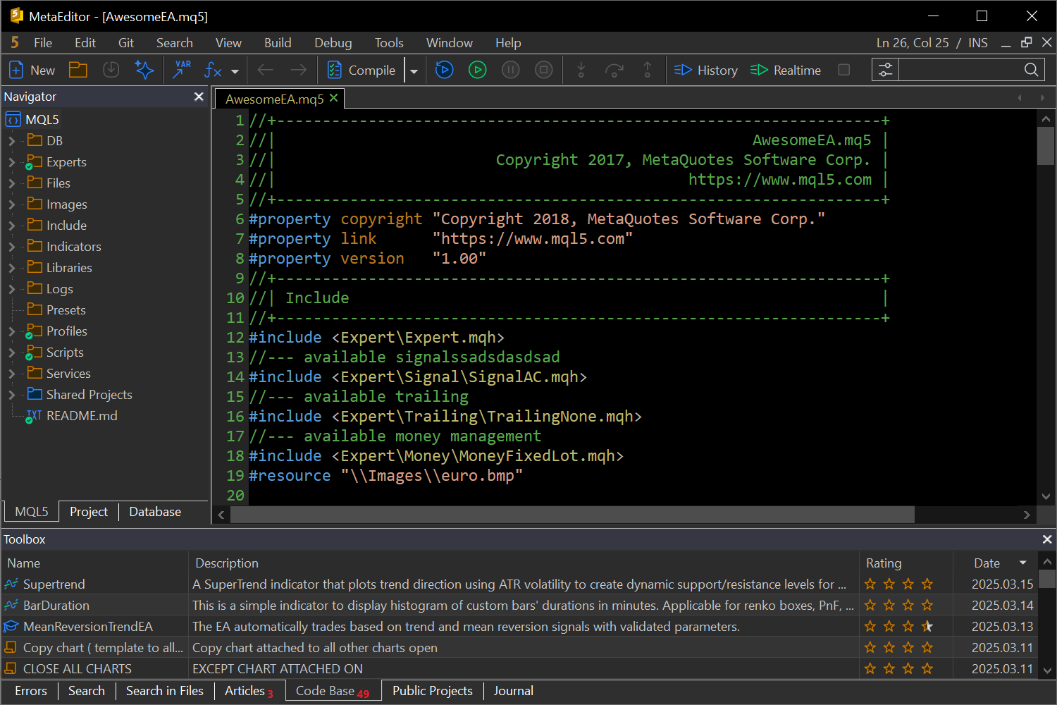 新版 MetaTrader 5 平台 Build 5100:过渡到 Git 和 MQL5 Algo Forge 开发者中心、深色主题和界面改进